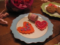 I have girlfriends coming over tonight to learn how to felt. Its going to be wildly fun. I'll post pics of our wooly valentine's later! (alright, its later now- and so without further ado- see the photos of Kim with her new monogrammed scarf, Jaala with the sweet valentine garland + moi, with a silly little badge...)
